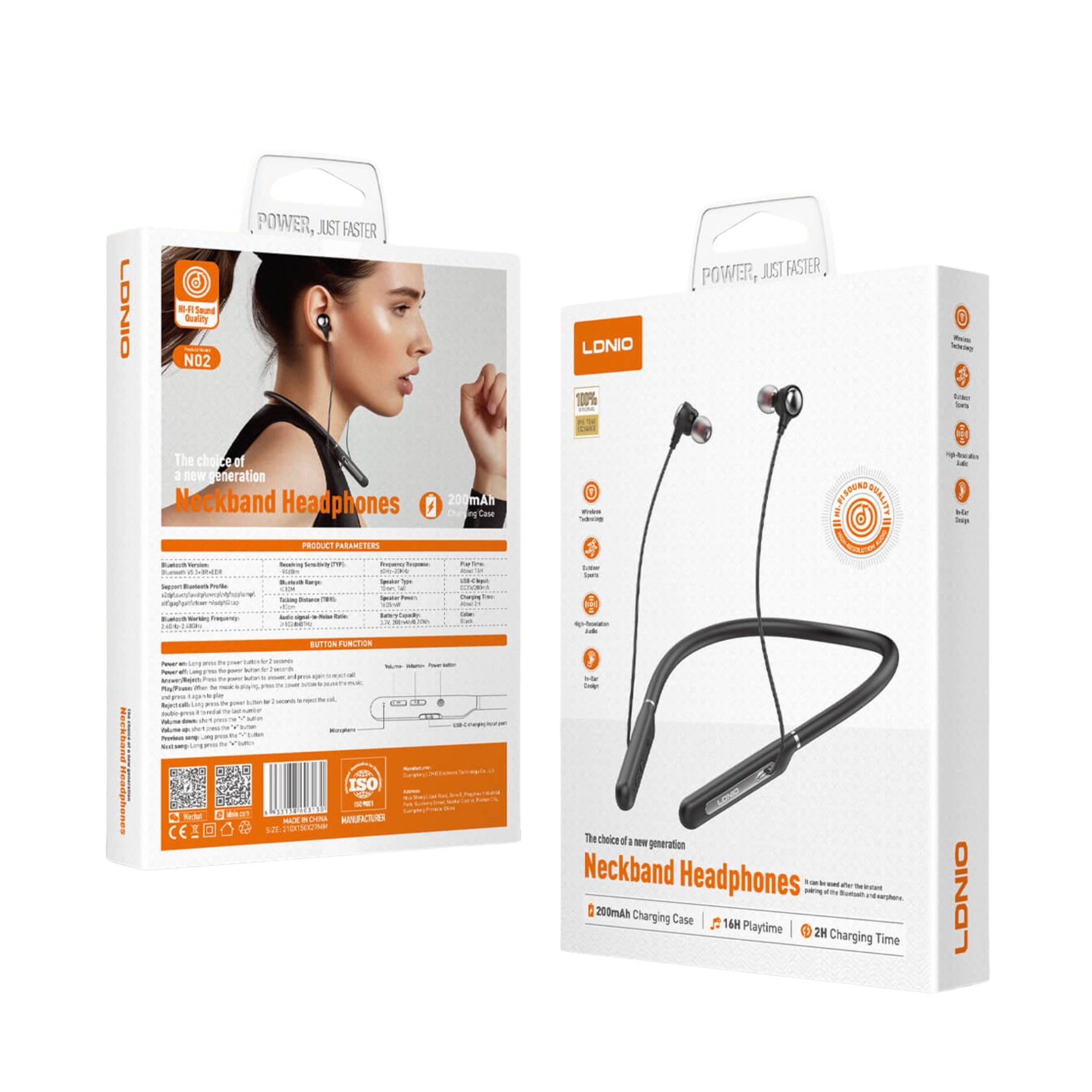 The LDNIO N02 Neckband is a stylish and practical wireless earphone designed for comfort and convenience. Its flexible neckband design ensures a secure fit, making it ideal for workouts, travel, and everyday listening. Equipped with HD stereo sound and enhanced bass, it delivers immersive audio for music and calls. With Bluetooth connectivity, the N02 pairs easily with smartphones, tablets, and laptops. The long-lasting battery supports extended playback, while the built-in microphone allows for clear hands-free calling. Lightweight and durable, the N02 is perfect for active lifestyles.
