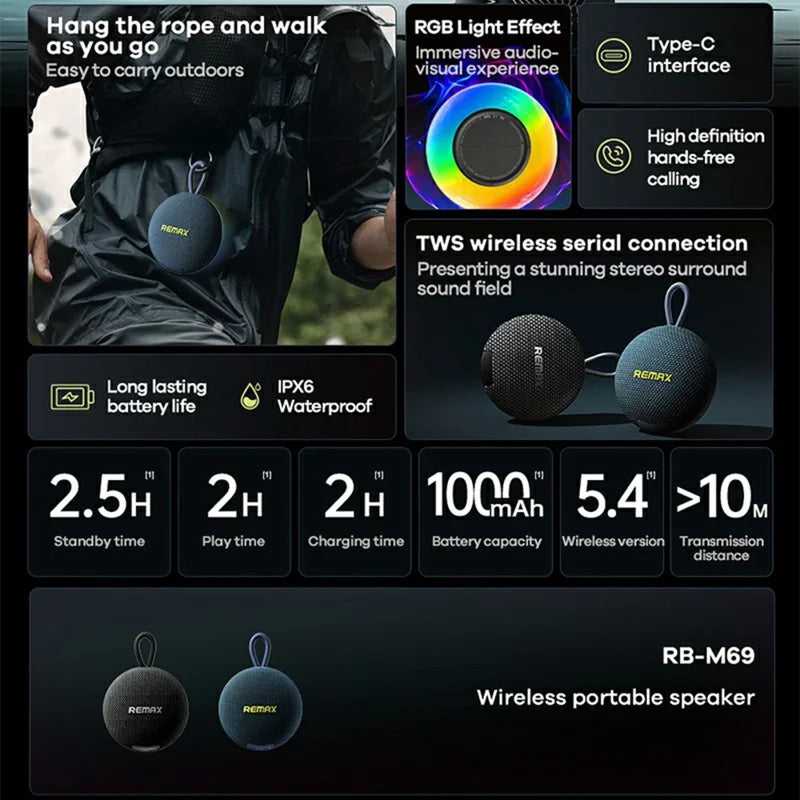 The Remax RB-M69 is a compact wireless speaker that delivers surprisingly powerful sound for its size. Whether you're relaxing at home, working at your desk, or heading outdoors, this speaker offers clear audio, stable Bluetooth connectivity, and a sleek design that fits anywhere.