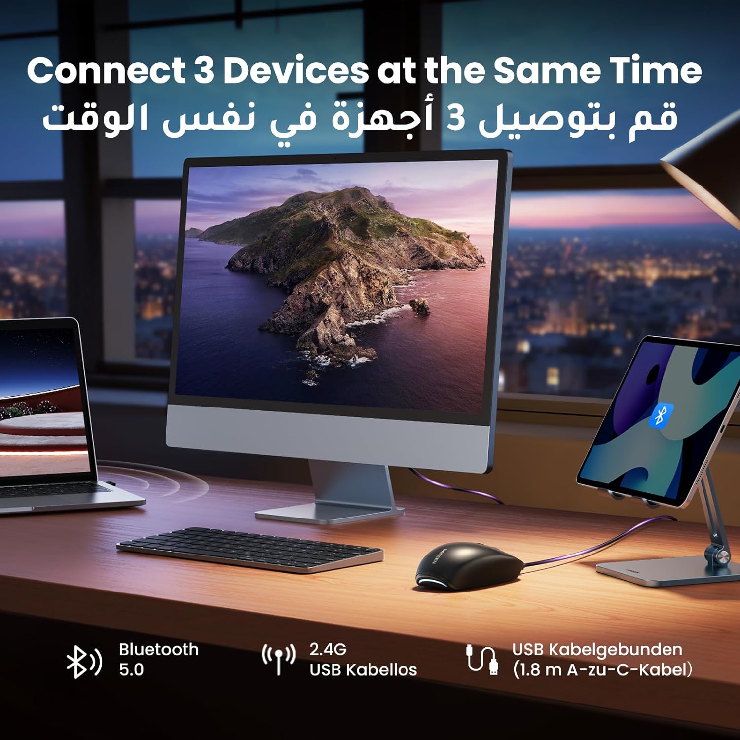 Tri-Mode Wireless – Switch between Bluetooth and 2.4GHz wireless; USB cable used only for charging